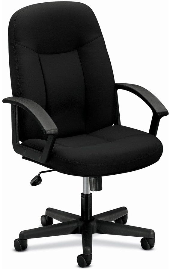 This high-back fabric office chair from Basyx™ features thickly padded, foam-filled seat and backrest cushions. It is available in stain-resistant, commercial-grade black fabric or soft-thread black leather upholstery, which is genuine leather that is polyurethane infused for added softness and durability. The chair ships in 1-2 days from multiple warehouses for quick delivery.