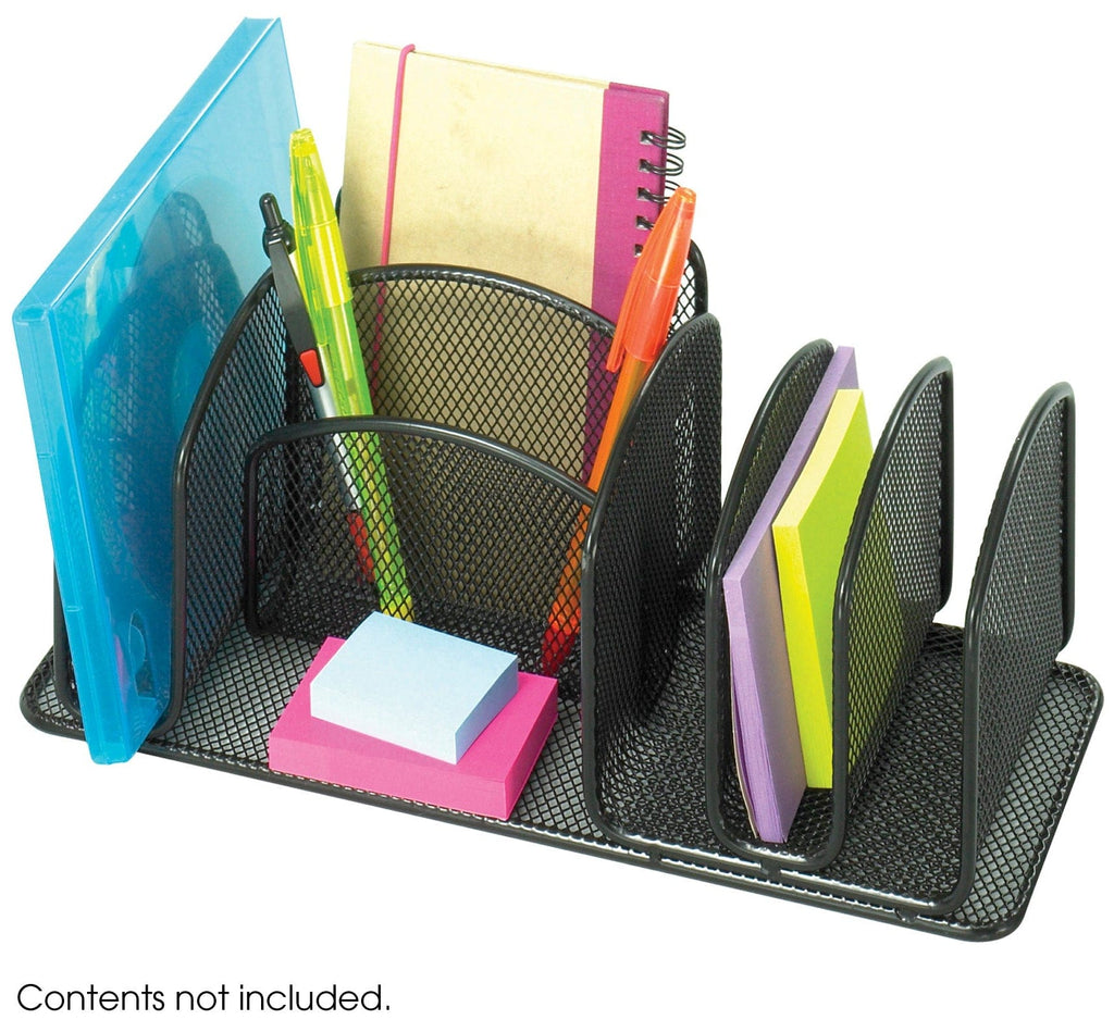 The Onyx™ Deluxe Organizer is a durable, wire mesh steel desktop organizer that promotes effective office organization. It features 2 small compartments for storage and 4 side compartments for notes and small documents. The organizer features a durable, black or silver powder-coated finish.