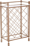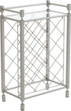 Introducing a robust tempered glass shelf, perfect for wine enthusiasts and stylish home decorators alike. This exquisite piece features an artistic arrangement of intersecting metal bars in a sophisticated champagne hue, designed to securely hold up to 17 wine bottles with grace and stability.