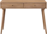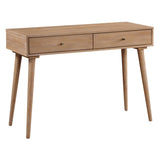 Our entry console table is a perfect blend of functionality and aesthetics, featuring contemporary, Mid-Century modern style elements. It serves as an ideal welcome for your entryway, a stylish addition to your home office, or a perfect finishing touch to your guest room. With its clean lateral surface and two pullout drawers, it provides ample space for your keys and other accessories. Our trendy design combines modern lines and appealing angles with a tapered leg, making it a perfect fit for any home decor. Made with solid woods and woodgrain veneers, it is a durable and elegant furniture piece that will complement any living space.