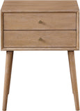 Our 2-drawer accent table offers both functionality and style with its contemporary, Mid-Century modern design. It is the perfect side table to place next to a sofa or sectional, providing a beautiful place to put a drink, TV remote, and device accessories. The trendy design features clean lines, attractive angles, and tapered legs. The light ash finish, gold-tone hardware, and solid woods with woodgrain veneers make this piece a great addition to any home décor.