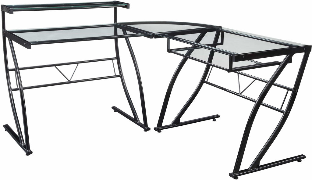 Looking to create a home office that is modern and functional? Consider the Constellation L-shaped Desk. It features tempered safety glass surfaces and an attractive metal frame that will give your workspace an open and airy feeling. The upper glass shelf is perfect for positioning dual monitors at the optimal viewing level, while the main desktop area can be used for multi-functional tasks or for a third monitor. The L shape with a corner return and a glass pull-out keyboard shelf provide even more usable surface area. With a durable and sturdy steel frame, you can expect to enjoy years of use from this desk. Plus, the simple, easy-to-follow assembly instructions make it a breeze to set up your gaming station or home office.