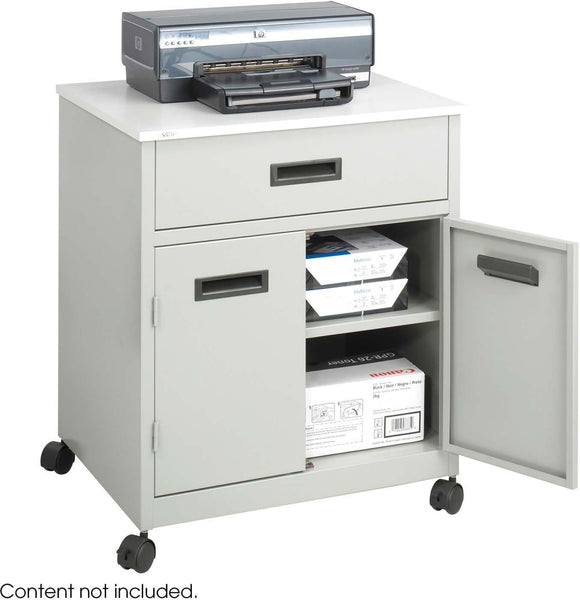 Create the ultimate mobile workstation with the Safco Steel Machine Stand. Crafted from gray, durable steel and scratch-resistant laminate, the Safco Machine Stand is perfect for high-traffic areas. Store facsimile machines, printers and typewriters on the top. Conceal documents and supplies in the pull-out drawer or large compartment on the bottom. Two of the four swivel casters have locking capability for added security.