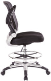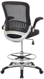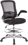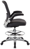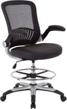 This drafting chair features a breathable mesh back that provides excellent support and ventilation, ideal for long hours of sitting. The seating area is upholstered in your choice of durable black faux leather or soft black fabric, offering a comfortable experience. The chair is equipped with a height-adjustable footring, allowing you to customize your seating position for optimal ergonomics. Additionally, the padded flip arms enhance comfort and can easily be tucked away when not in use. The sleek silver frame adds a modern touch while ensuring stability. For added convenience, the pneumatic seat height adjustment lets you effortlessly raise or lower the seat to your preferred height.