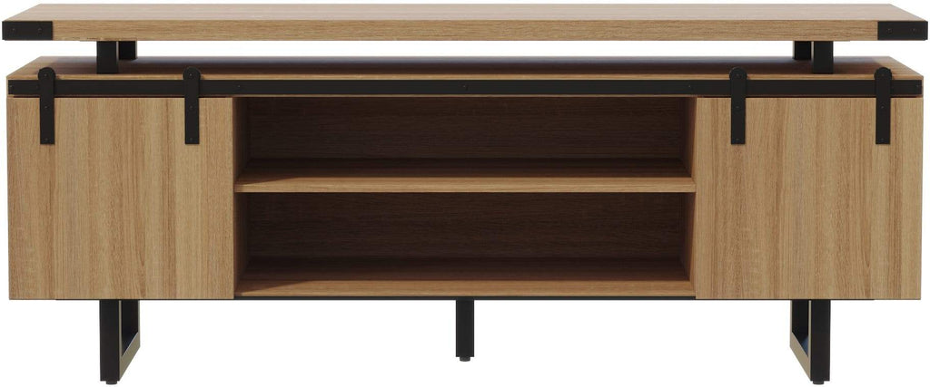 - Complete with two storage cabinets and two open shelves for compartmentalized storage