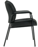 This guest chair from Offices To Go™ features attractive black Luxhide leather upholstery on all seated surfaces with matching mock leather trim on the outer edges. Luxhide leather is a bonded reconstituted leather consisting of genuine leather fibers combined with other materials for long-lasting durability.
