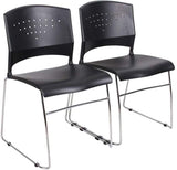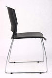 - An opening integrated in the sculpted seat back allows for ease of movement and stacking