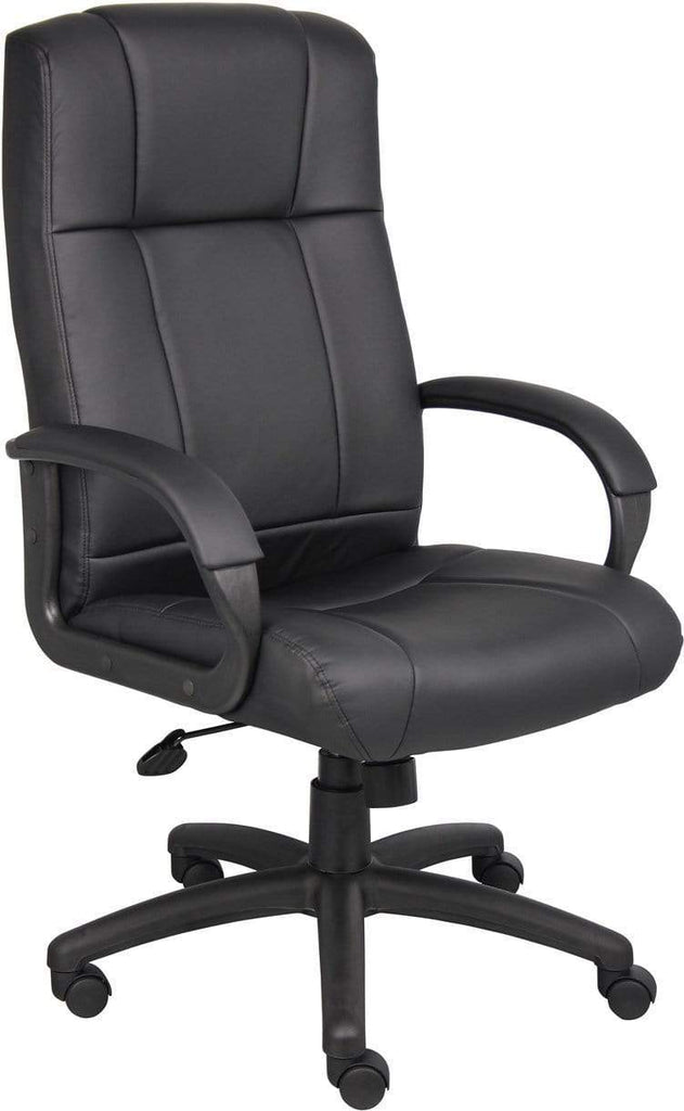 This executive high back chair is elegantly upholstered with extremely soft and durable Caressoft vinyl. It features integrated lumbar support and padded armrests decorated in comfortable CaressoftPlus upholstery. Additional features include an upright locking position, adjustable tilt tension control, and pneumatic gas lift seat height adjustment for a seat height that extends from 20” to 23.5”. All of this sits atop a sturdy 27” nylon base with five hooded double-wheel casters for exemplary stability and maximum mobility.