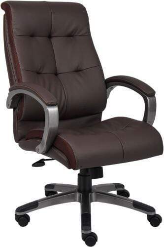 This high back executive office chair from Boss Office Products is available in your choice of brown or black LeatherPlus upholstery. LeatherPlus is a urethane infused leather that is soft to the touch yet extremely durable. Features include a thick, double padded seat and backrest cushions, ventilated mesh side panels on the seat and backrest, built-in lumbar support, pneumatic seat height adjustment, 360-degree swivel, tilt with adjustable tilt tension, upright tilt lock, leather padded loop arms, pewter or silver finish frame accents and a heavy duty five star base with dual wheel carpet casters. Meets or exceeds ANSI/BIFMA standards.