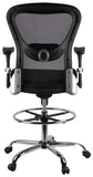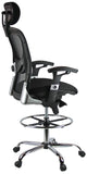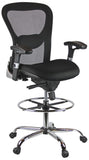 This contemporary mesh drafting stool from Harwick features a breathable mesh back with built-in lumbar for maximum support and ventilation. Adjustments include pneumatic seat height adjustment, 2 to 1 synchro-tilt (the back reclines at a faster pace than the seat to keep your feet flat on the floor), height and width adjustable armrests, lumbar tension adjustment (adjusts up/down and in/out) and a waterfall seat to relieve pressure on your legs so you can sit comfortably for longer periods of time. The large 20" chrome foot ring adds an attractive contemporary style. It also includes a heavy-duty, chrome-plated steel base with dual-wheel casters.