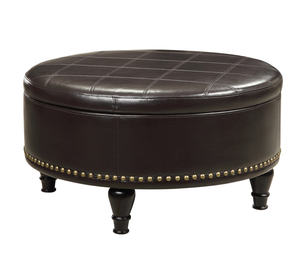 The ottoman has inner storage with a 32” diameter and a depth of 12.75”