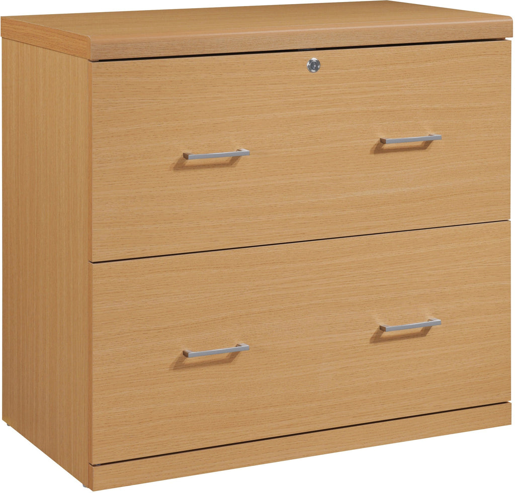 Stay organized and keep your documents secure with our 2-drawer locking lateral file cabinet. This cabinet is designed with dual drawer pulls and euro-style easy glide hardware, which makes opening and closing the double width drawers effortless. It can accommodate both legal and letter-size files, and the top drawer has a locking mechanism for added security. The assembly process is simplified with Lockdowel™ fasteners, which are invisible and create a tight joint for a finished look. The Lockdowel™ fastening system is designed to make assembly quick and sturdy every time by simply sliding components into place.