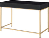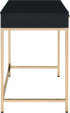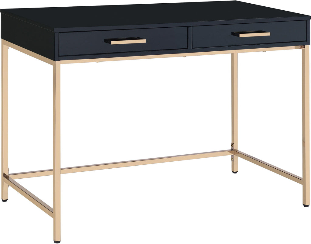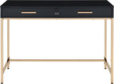 Transform your home office into a stylish and elegant space with the Alios Writing Desk. The desk features a sleek, high-gloss work surface supported by a stunning gold base, providing a sophisticated workspace to answer your emails, write a quick note, or pay bills. Keep your office accessories organized with two spacious drawers. You can add a touch of sophistication to your guest room or family room with this unique and stylish workspace that complements your existing décor.