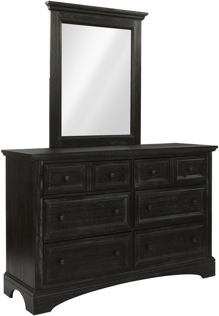 Inspired by the farmhouse look, this rustic black dresser fits a variety of décor and comes with a complementing framed beveled mirror. The overcoat replicates a slightly weathered look into deep-grained wood veneer. Made of mahogany with albizia wood veneers under a six-step finishing process. Two felt-lined top drawers and four large bottom storage compartments provide spacious room for your clothing. Contained within a sturdy, solid wood frame, you will find that the Farmhouse Basics dresser and mirror set will help you prepare for the day.