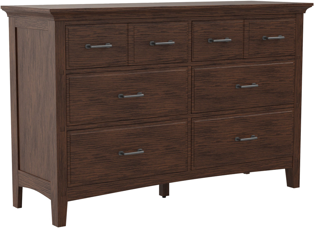 The Modern Mission Collection is a contemporary take on the classic Craftsman design. This updated version features darker hues in the finish, with a deep oak grain look and feel. The five-step finishing process is perfectly complemented by the beauty of the new gunmetal hardware. The top drawers are lined with felt, making them ideal for storing jewelry or delicate items, while the four deep drawers offer ample space for clothing or accessories. All drawers feature heavy-duty metal side glides, making them easy to open and close. Get ready for your day with ease, thanks to our Modern Mission six-drawer dresser.