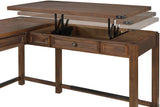 Our patented soft-close mechanism slows the lifted desktop inches from the lowest position, preventing it from slamming. The desk features beautiful, paneled drawers that hold all your office accessories, and power is located inside the top drawer, keeping your devices powered up and fully charged at all times. Cable management ensures that your cables and wires stay out of your way. The desk is available in both dark woodgrain and light antiqued wash finishes, and it is made of solid wood and select veneers, ensuring lasting durability and beauty.