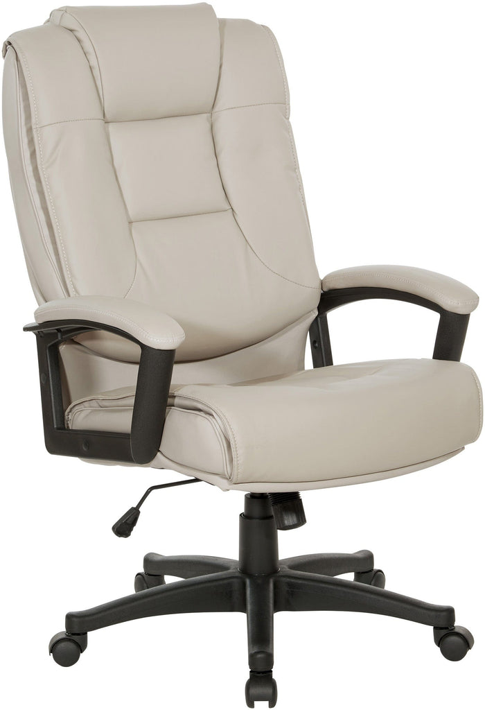 Elevate the look of any office space with our high back bonded leather chair equipped with padded loop arms. It boasts a thickly padded contour seat and back with built-in lumbar support, one-touch pneumatic seat height adjustment, and locking tilt control with adjustable tilt tension. This chair is the perfect blend of style and comfort. The heavy-duty nylon base with dual-wheel carpet casters ensures easy mobility.