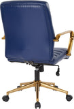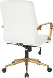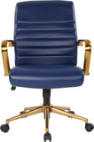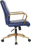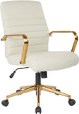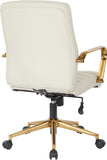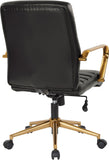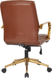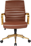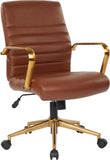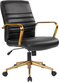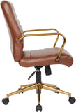 The Baldwin Mid-Back Faux Leather Chair is a modern office chair that offers ergonomic comfort and an attractive gold-finished base and arms. It comes with built-in lumbar support, one-touch pneumatic seat height adjustment, locking tilt control, adjustable tilt tension, and dual wheel carpet casters.