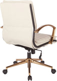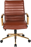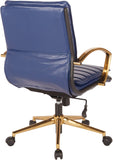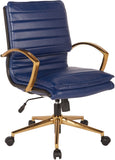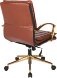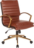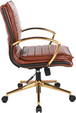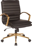 Introducing the Mid-Back Faux Leather Chair from Work Smart - the perfect solution for those who want to work in style and comfort. This office chair features thick and contoured seating, providing maximum comfort and little resistance. It comes with adjustable features such as pneumatic height adjustment, built-in lumbar support, and locking tilt control with adjustable tilt tension. The chair is also decorated with extravagant gold accents that cover the arms and base, adding a touch of luxury to your workspace. Don't you deserve to feel good while you work? Choose the Mid-Back Faux Leather Chair from Work Smart and experience the perfect blend of functionality and charm.