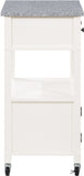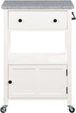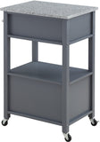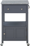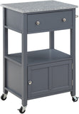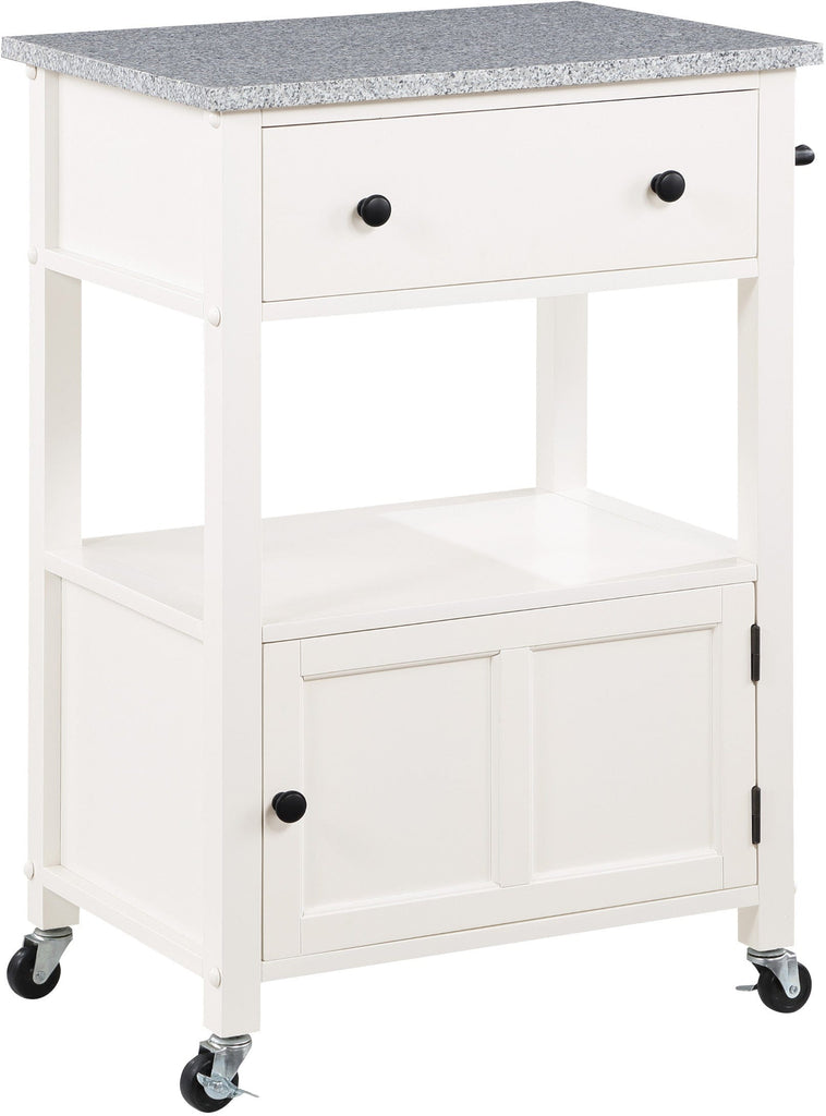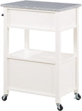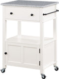 Our Kitchen Cart with Granite Top is a perfect blend of beauty and functionality, inspired by the classic charm of modern farmhouse design. Its versatile design makes it ideal for food preparation, serving, and kitchen storage. The cart is painted in a wood finish and features a durable granite food prep surface, giving it a beautiful look from all angles. The top drawer provides convenient storage for all your cooking utensils. The mid-level shelf is perfect for showcasing extra-large pots, while the lower storage compartment is spacious enough for storing large mixing bowls and serving pieces. Towel bars and heavy-duty hardware ensure its long-lasting appeal. This charming kitchen cart is a must-have addition to any home, and it is sure to become your new favorite place for cooking and storing away countertop clutter.