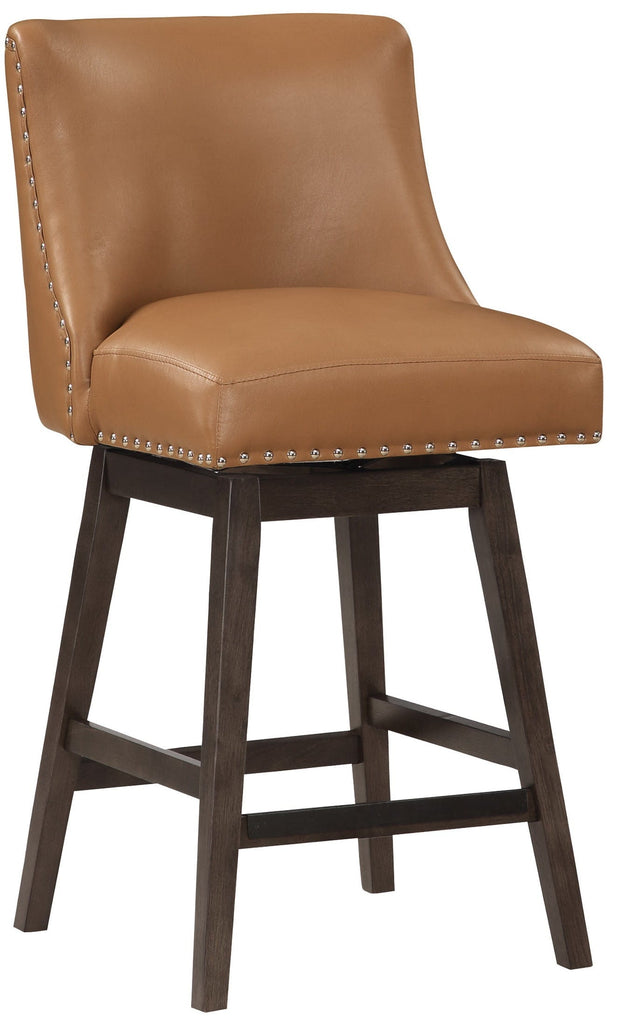 Enjoy the comfort and beauty of a modern, contemporary design with this counter stool. It's perfect for a kitchen island or any casual eating area that's counter-height. The padded back and seat are well-positioned and detailed with tailored nailhead trim, making it an essential solution for active seating. With full swivel motion, you can easily converse and eat with ease. The stool is made with 100% polyester fabric, which is dependable, and the solid wood frame ensures durability and beauty. Assembly is required.