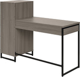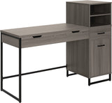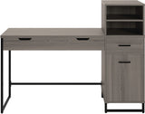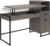 You can adjust the desk to three different heights: the lowest position is ideal for classic desk work, the mid-position is perfect for projects and drawing, and the upper position is great for standing. The desk also features a side hutch with two open shelves for convenient storage, a desk drawer, and a 2-shelf cabinet for additional supplies. There are also integrated interior storage compartments to keep little things out of sight and your workspace tidy and organized.