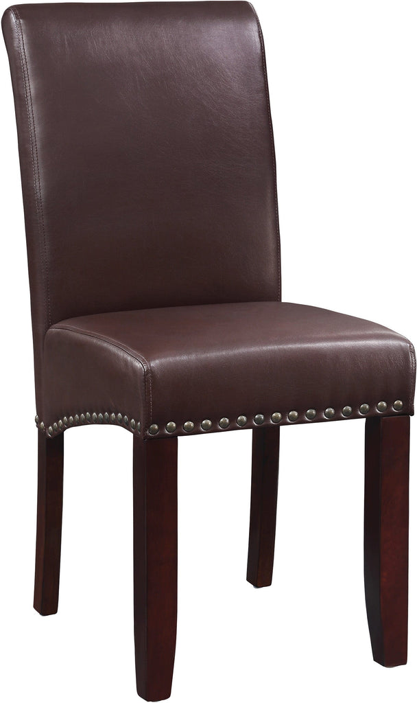 The Parsons Dining Chair is a stylish and sophisticated addition to any dining room, whether it has a Modern, Contemporary, or Traditional decor. It boasts a tall, elegant and padded back with gently scrolled shoulder detail, paired with a comfortable padded seat. The chair is accentuated with Antique Bronze nailhead trim, which adds interest to its design. The solid wood leg construction ensures quality and durability. The chair is available in both supple faux leather and trendy 100% polyester fabric, which makes it easy to clean and ideal for busy families. It is perfect seating for your dining room, kitchen, or even as a pretty office chair at any writing desk. Assembly is simple.