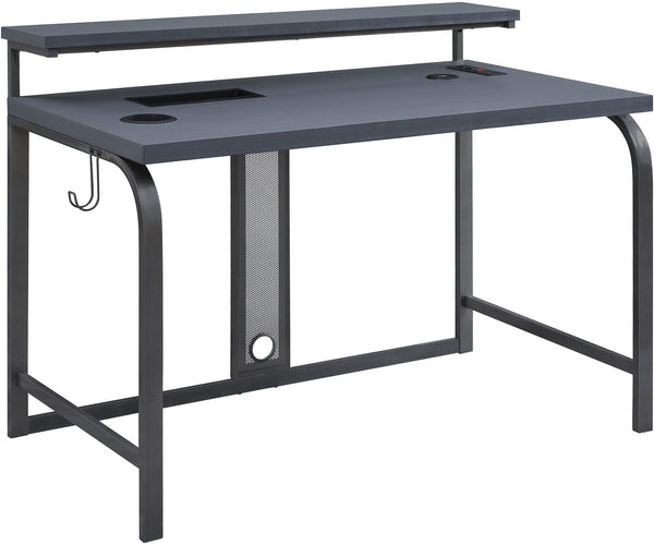 Enhance your gaming experience with the Reload 48" Gaming Desk. The elevated monitor shelf is positioned at an ideal viewing height to reduce neck, shoulder, and eye fatigue. The spacious 48" lower surface provides ample room to accommodate all your gaming gear. Immerse yourself in your gaming experience with customizable RGB LED lights. You can even position your wireless charging pad and USB power port according to your preferences. Keep your eyes on the game with the strategically placed device holder and accessory tray. With the integrated storage and power cable management system, you can keep your area distraction-free and effortlessly transition from gaming to working. The sturdy steel construction frame with a sleek carbon fiber finish surface ensures years of competitive enjoyment. The headphone hook and drink holder complete this winning choice.