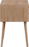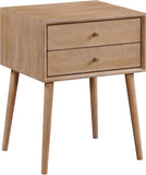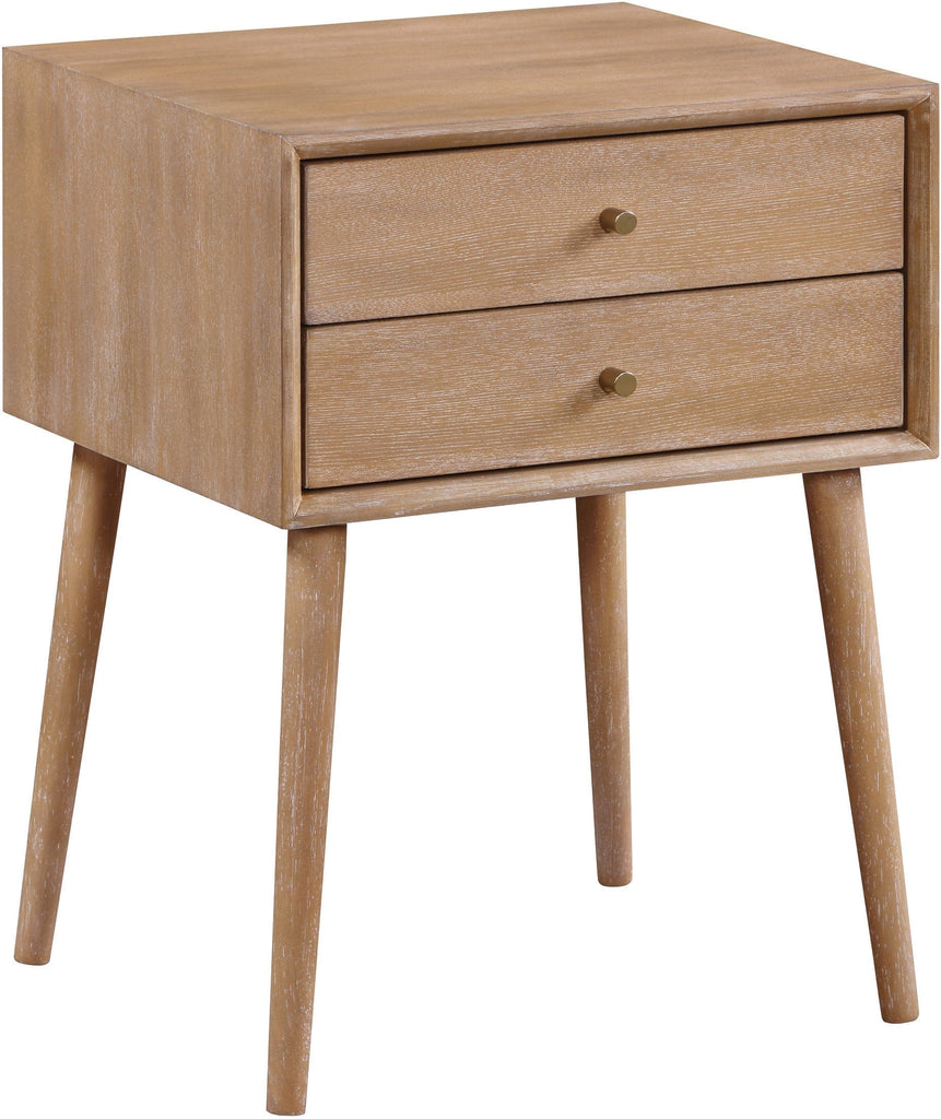 Our 2-drawer accent table offers both functionality and style with its contemporary, Mid-Century modern design. It is the perfect side table to place next to a sofa or sectional, providing a beautiful place to put a drink, TV remote, and device accessories. The trendy design features clean lines, attractive angles, and tapered legs. The light ash finish, gold-tone hardware, and solid woods with woodgrain veneers make this piece a great addition to any home décor.
