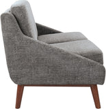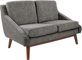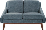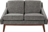 Whether you're enjoying a delightful conversation or getting lost in an intriguing novel, you're going to adore this open-arm style loveseat. It's a redesigned version of mid-century styles and comes with sloped arms that expose thick, comfortable cushions. You can enjoy the elegance of this loveseat with its upholstered frame accented with solid wood legs and wood frame rails in a rich, coffee finish. The period-influenced fabrics add a subtle sophistication to modern and contemporary interiors, making this loveseat a perfect addition to your living space.