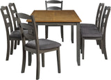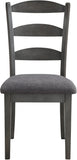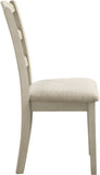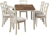 Introducing our traditional 7-piece dining set, the perfect gathering spot for your family and friends. The attractive two-tone style features a beautiful natural woodgrain veneer top and a lightly distressed solid wood painted frame that creates a classic farmhouse feel. The set is crafted with durable rubberwood solid block and brace construction to ensure leisurely dining and conversations for years to come. The chairs are designed with high, comfortable backs, padded 100% Polyester upholstered seats, and tapered legs. The set includes a table and 6 matching chairs.