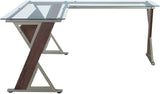 Upgrade your home office with the Zenos 66" x 66" L-shaped Glass Top Desk featuring wood and metal mixed media accents. The chrome standoffs create a clean, modern look by giving the 8mm tempered glass worksurface a floating effect while showcasing the beauty of the beveled edge. The "Z" frame design not only adds strength but also offers visual interest. The lower privacy screen has been integrated as a bookshelf, providing additional storage space. With its ample "L" shape, this desk offers a spacious work surface that enhances any workspace. Assembly instructions are included, making it easy to set up.