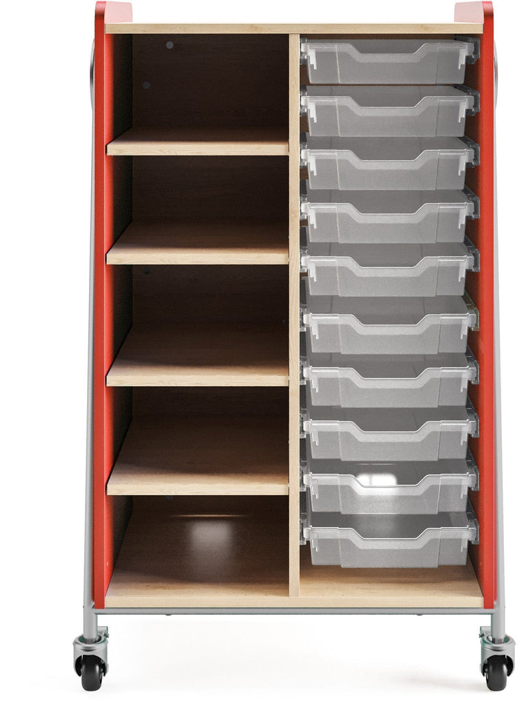 Introducing the Whiffle rolling storage solutions - the perfect solution for all your mobile storage needs. This versatile double-column office rolling cart features ten removable tote drawers, each measuring 3 inches tall, and four open shelving cubbies. The top surface is made of high-pressure laminate (HPL), making it a tough, durable work surface. The rest of the structure is made of Thermal-Fused Laminate (TFL), ensuring that this cart will withstand the test of time.