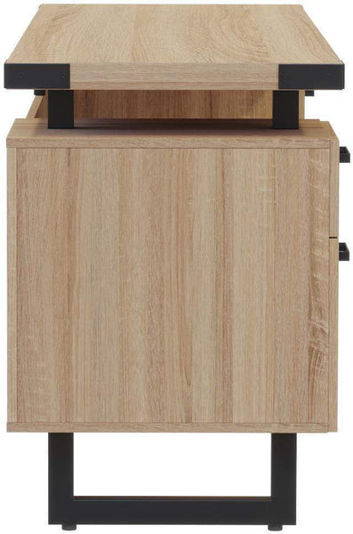 - Complete with double pedestals featuring one with three storage-sized drawers and one with a storage drawer and a file drawer accentuated with discrete brackets giving the appearance of a floating workstation