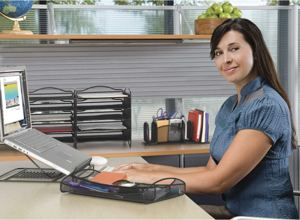 The Onyx™ Deluxe Organizer is a durable, wire mesh steel desktop organizer that promotes effective office organization. It features 2 small compartments for storage and 4 side compartments for notes and small documents. The organizer is built with a durable, black powder-coated finish.