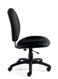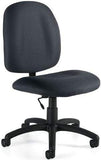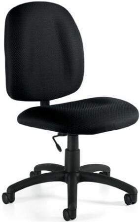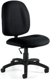 This armless task chair from Offices To Go™ features durable, textured fabric upholstery over a thickly padded seat and backrest cushion for added comfort. Other features include one touch pneumatic seat height adjustment, 360-degree swivel, seat depth adjustment for a customized fit, fixed back angle, and scuff resistant, arched molded base with twin wheel carpet casters. This task chair meets or exceeds ANSI/BIFMA standards. Dimensions: Seat Size: 21"W x 17" - 18.5"D. Back Size: 18"W x 19"H. Seat Height: 17.5" - 22.5"H. Overall: 38"H x 21"W x 25"D. Five year warranty from Offices to Go.